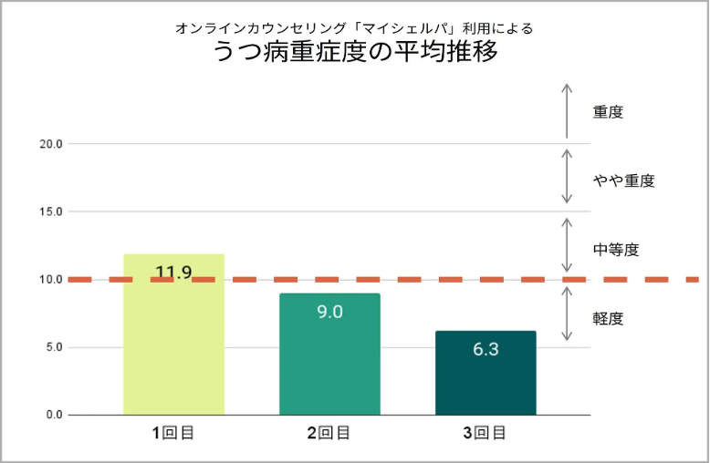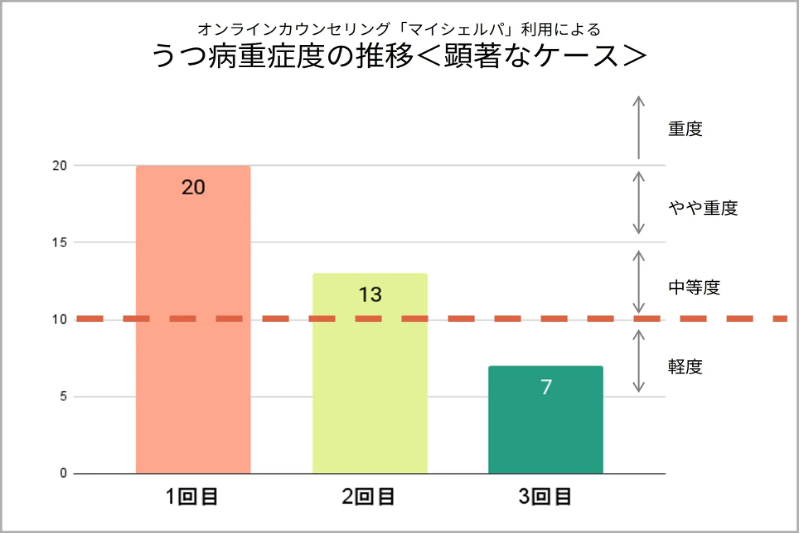 臨床心理士または公認心理師による継続的なカウンセリングにより、利用者のうつ症状が初回は中程度だったものが、3回目には軽度まで改善したことを定量的データにより確認されています。