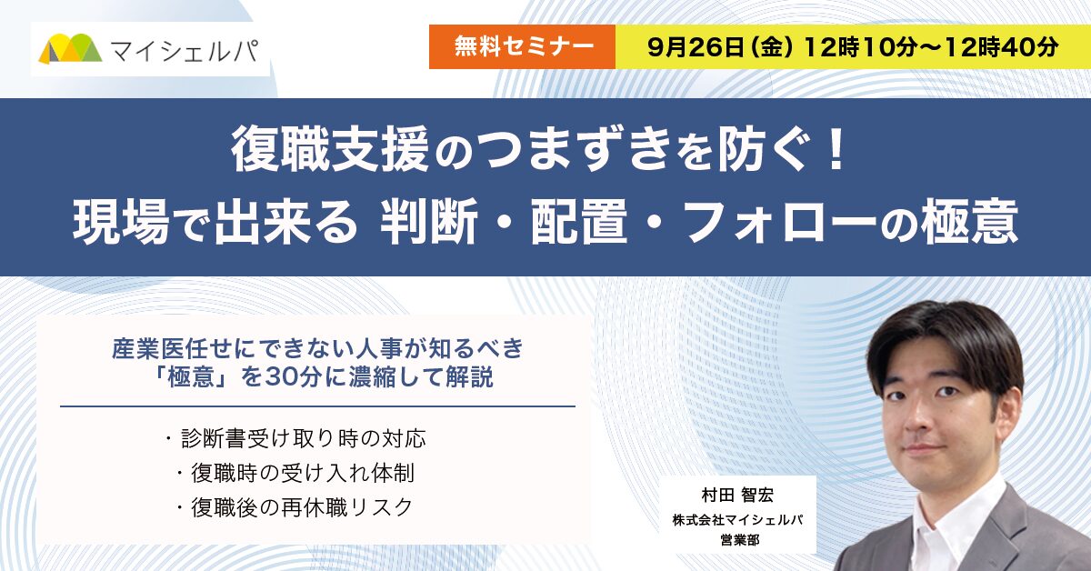 本セミナーでは、産業医任せにできない人事が知るべき「極意」を30分に濃縮して解説します。
